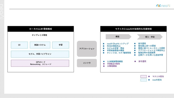 株式会社マクニカ(本社: 横浜市港北区、代表取締役社長: 原 一将、以下マクニカ)と株式会社neoAI(本社: 東京都千代田区、代表取締役CEO: 千葉 駿介、以下neoAI)は、大規模言語モデル(LLM)をオンプレミスで利用可能にする生成AI活用ソリューション提供における協業を開始することを本日発表いたします。マクニカがもつAI環境構築の専門知識とneoAIがもつ先進的なAI技術を融合し、国内企業のデジタルトランスフォーメーション(DX)加速と生成AI実用化を推進します。