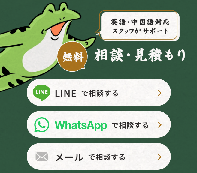 「日本の法律が分からない」「専門業者と意思疎通ができない」という悩みを抱える外国人オーナー様のために、英語・中国語(繁体字・簡体字)が可能なスタッフが直接サポートいたします。また、民泊に関する無料相談は、LINE、メールに加え、WhatsAppからも可能です。オーナー様にとって最も負担の少ない方法をお選びください。