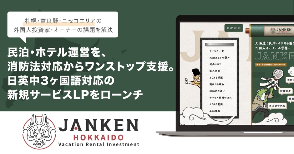 北海道の民泊・ホテル運営を消防法対応からワンストップ支援。 「JANKEN」が日英中3ヶ国語対応の新規サービスLPをローンチ