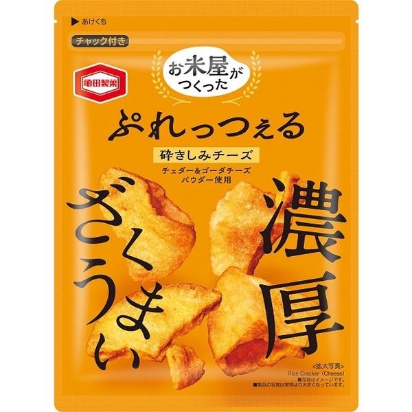 『お米屋がつくった ぷれっつぇるチーズ』は、独自の米菓製法を用いて、中までたっぷりと味をしみ込ませた濃厚な味わいとざくざく食感の“ぷれっつぇる”です。焼き上げた堅焼せんべいをあえて細かく不揃いに砕き、砕いた生地をチェダーチーズとゴーダチーズをベースにした濃厚チーズソースの中へどっぷりと漬け込むことで、生地の断面や空洞の中にまでたっぷりと味がしみ込んだ驚きの濃厚感を実現しました。ざくざくとした食べ心地でとまらない美味しさです。