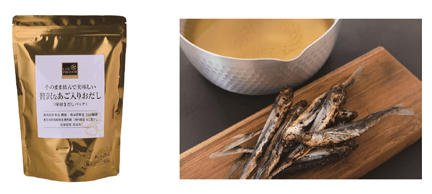 ①「ライフプレミアム そのまま飲んでもおいしい贅沢なあご入りおだし」を使用