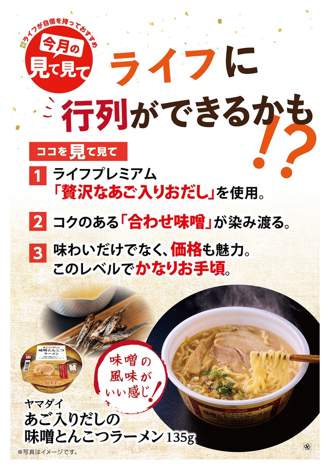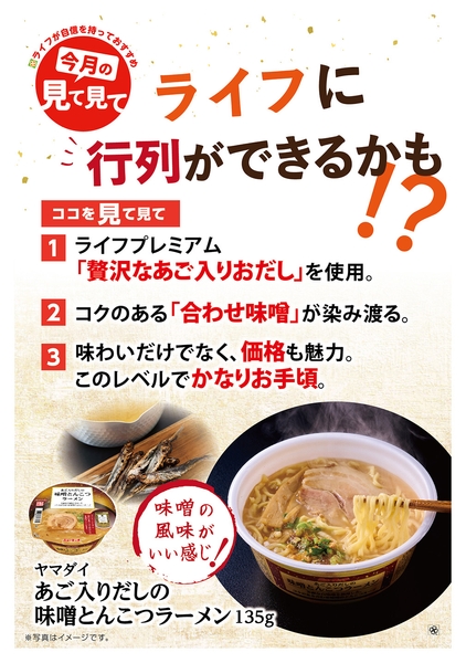 コロナ禍によりご家庭で”プチ贅沢”を楽しまれる方が多くなり、高価格帯のカップラーメンの売上が伸長しています。カップラーメンの売上が最も高くなる12月に、冬場に人気の「味噌フレーバー」のオリジナル商品を販売したいと思い、開発いたしました。ライフプレミアムの商品を使用したリッチな味わいでありながら、高価格帯のカップラーメンの中ではお手頃価格でお買い求めいただけます。ライフでしか買えない味を、ぜひお召し上がりください!
