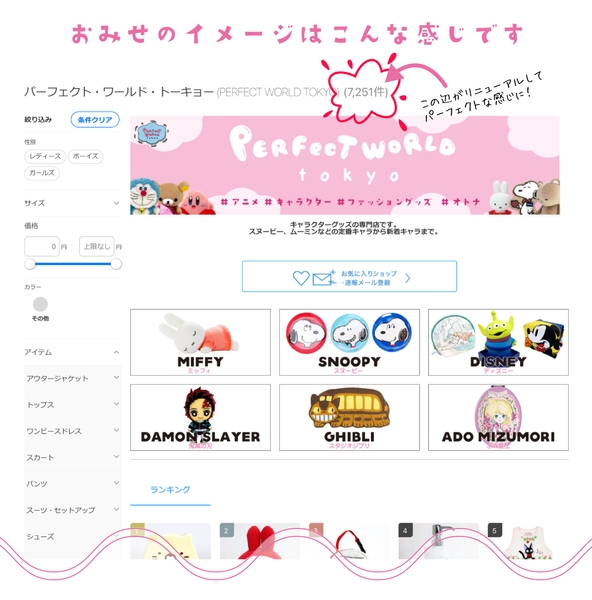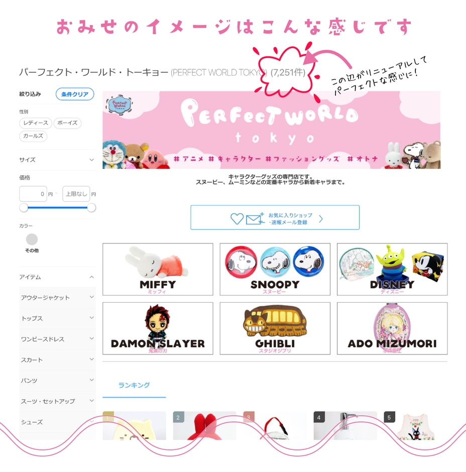 パーフェクトワールドトーキョーは、アニメやキャラクターグッズを10,000点以上扱う国内最大級のキャラクターオンラインストアです。スヌーピー、ミッフィなどの生活雑貨からポケモン、コナンといったアニメグッズまで10,000点以上を広く取り扱っております。時折企画される数量限定アイテムやコラボアイテムを楽しんでください。最新ニュースはSNSからどうぞ。キャラクター文化のあるここトーキョーから世界へ、情報やグッズを元気にお届けしてまいります♫