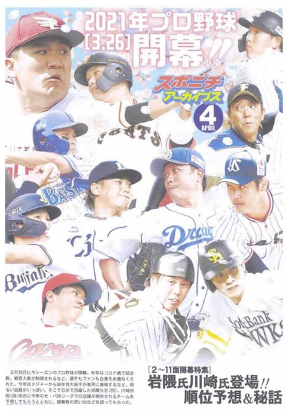 スポニチアーカイブス4月号「2021年プロ野球開幕特集」4月1日発売。岩隈・川崎両氏による順位予想や、開幕戦名場面などを掲載。