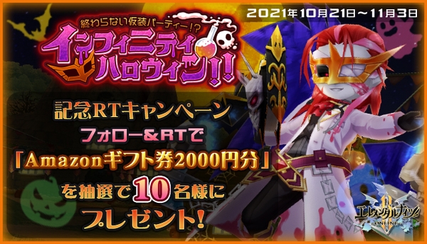 株式会社ウインライトは、本格MMORPG『エレメンタルナイツオンラインR』で、10月21日メンテナンス後より、ランキングイベント「終わらない仮装パーティー!?インフィニティハロウィン」を開始いたします。