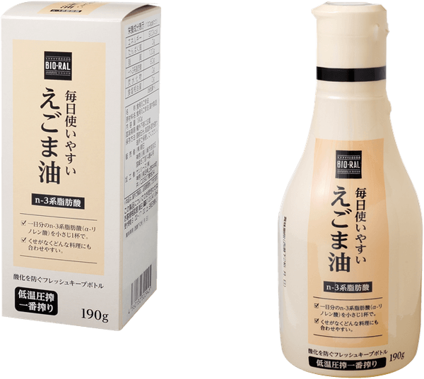 酸化防止ボトル容器を使用しており、普段使いしやすいえごま油。すっきりとした味わいで、1日分のオメガ3(α‐リノレン酸)を小さじ1杯で摂ることができます。