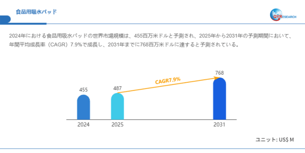 QYResearchが発表した新たな市場調査レポート「食品用吸水パッド―グローバル市場シェアとランキング、全体の売上と需要予測、2025~2031」によると、世界の食品用吸水パッド市場規模は2024年の約455百万米ドルから2025年の487百万米ドルへと順調に拡大すると見込まれ、予測期間中は年平均成長率(CAGR)7.9%で成長し、2031年には768百万米ドルに達すると予測されている。