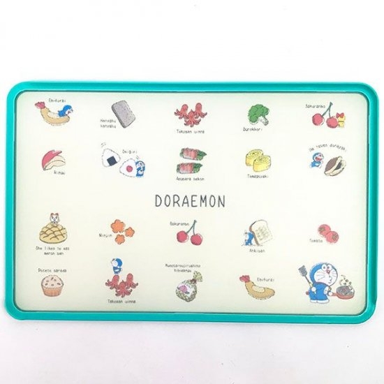 美味しそうなおかずやおやつをよーく見ると、小さなドラえもんが隠れているユニークなデザインのまな板。