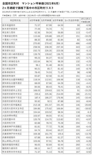 ・2021年4月から2ヶ月連続で坪単価が下落したのは36市区。