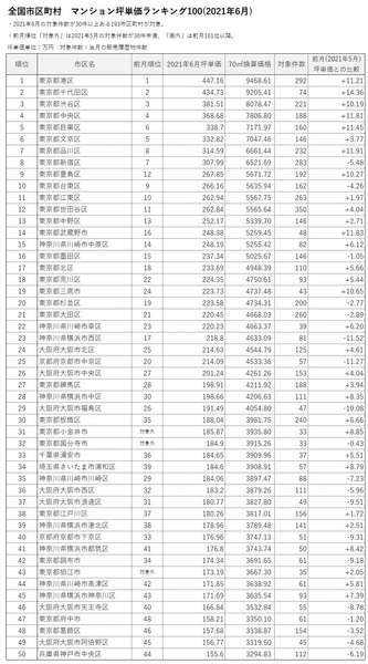 「マンションレビュー」2021年6月 全国市区町村 マンション坪単価 ランキング100を発表