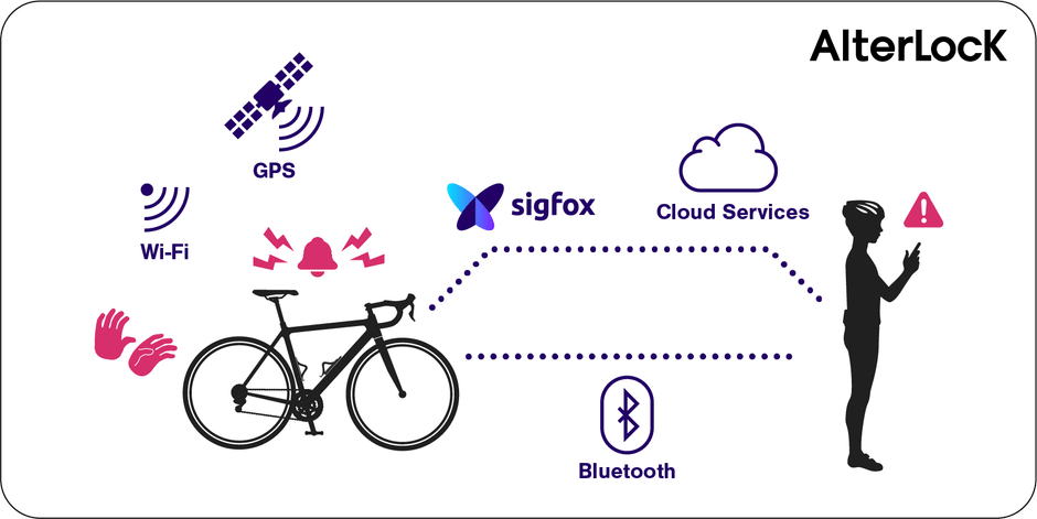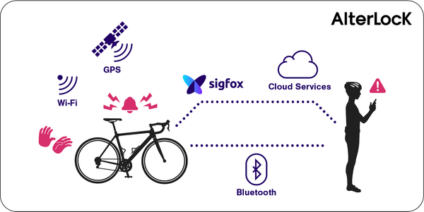 振動検知アラーム + GPS / Wi-Fi測位 + LPWA「Sigfox」通信機能を搭載したスポーツ自転車向けの盗難防止IoTデバイス「AlterLock」の新モデルです。