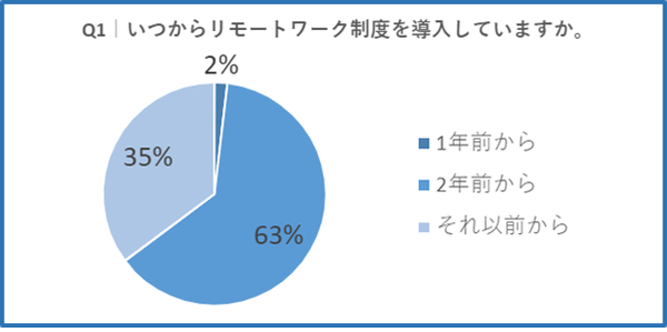 「Q1. いつからリモートワーク制度を導入していますか?」と質問したところ、「1年前(2021年)から」が2%,「2年前(2020年)から」が63%、「それ以前から」が35%という回答となりました。