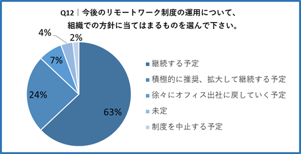 「Q12. 今後のリモートワーク制度の運用について、組織での方針に当てはまるものを選んで下さい」と質問したところ、「継続する予定」が63%、「積極的に推奨、拡大して継続する予定」が24%という回答となりました。