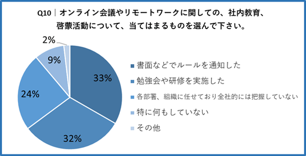 「Q10. オンライン会議やリモートワークに関しての、社内教育、啓蒙活動について、当てはまるものを選んで下さい。」と質問したところ、「書面などでルールを通知した」が33%、「勉強会や研修を実施した」が32%という回答となりました。