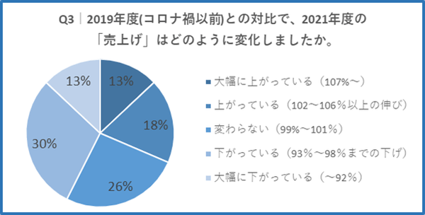 「Q3. 2019年度(コロナ禍以前)との対比で、2021年度の売上げはどのように変化しましたか?」と質問したところ、「大幅に上がっている」「上がっている」が合計31%、「下がっている」「大幅に下がっている」が合計43%という回答となりました。