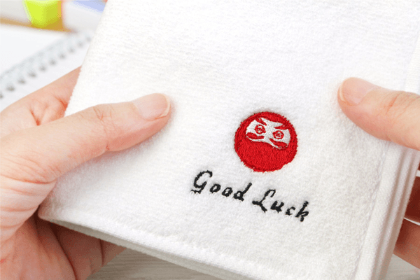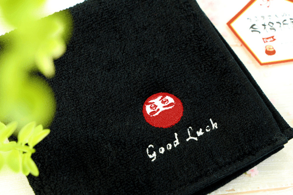 縁起の良い赤色のだるまと「頑張れ」「うまくいくと良いね」の意味がある“Good Luck”を刺繍したタオルハンカチは、ホワイトとブラックの2カラーをご用意。タオルごとに特徴があるので、お好みでおえらびいただけます。