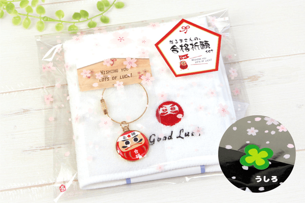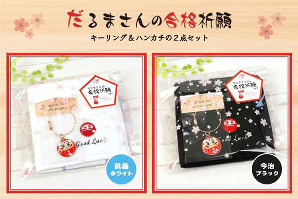 今回販売した「だるまさんの合格祈願セット」は、受験当日まで持ち歩きやすいハンドタオルとキーリングの2点セット。周りの友人はライバル同士、1人孤独でがんばる受験生の近くで、だるまさんが応援してくれるプレゼントです。