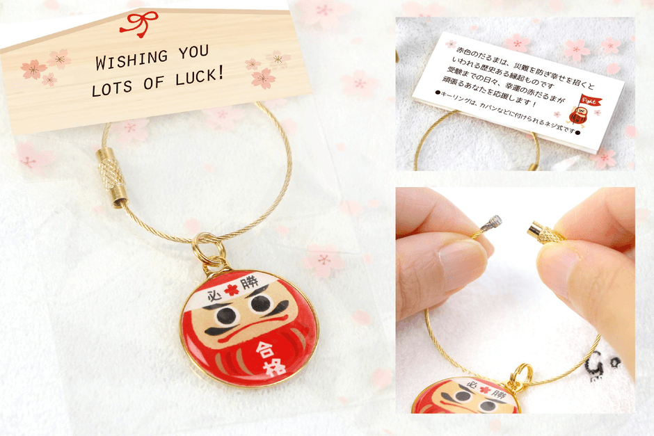 赤色のだるまは、厄除けや願いをかなえる縁起物として、江戸時代より愛され続けている人気のモチーフ。受験までの日々を、気合いのはいっただるまさんが、がんばる受験生を応援します。高級感を感じさせるゴールドカラーのネジ式リングは、通学カバンやリュックなどに気軽につけることができるのでおすすめです。相手にもコンセプトが伝わるメッセージつきです。