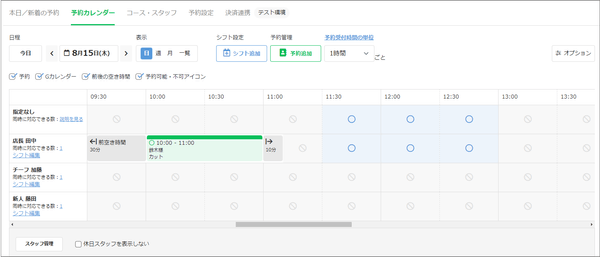 たとえば、複数人で運営している場合、スタッフのシフトや予約状況を一覧で把握が可能です。