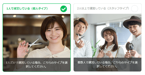 サロン予約機能では、個人運営のお店かスタッフがおり複数人で運営しているお店かを選べます。