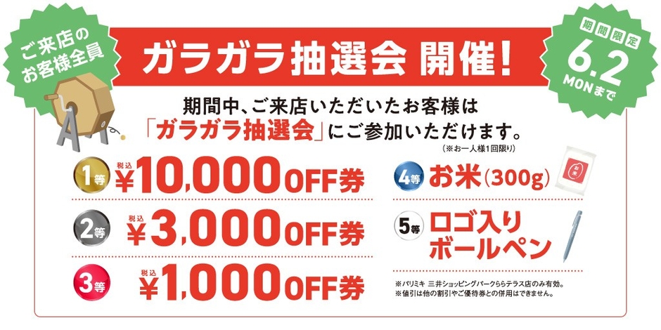 5月31日(土)~ 6月2日(月)までの3日間「ガラガラ抽選会」を開催いたします。