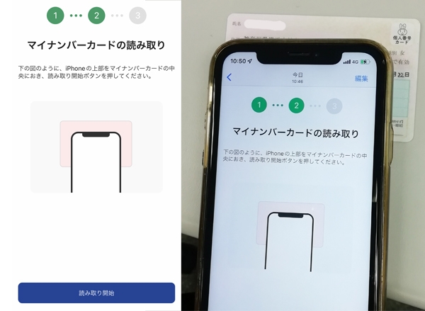 カードの上にスマホを置き、読み取りボタンを押すとマイナンバーカードに登録された情報を読み込めます。