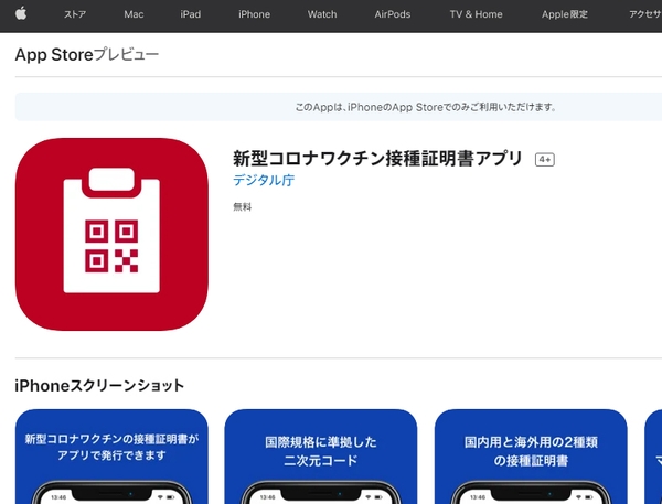 新型コロナワクチン接種証明書アプリ:App Storeウェブサイト
