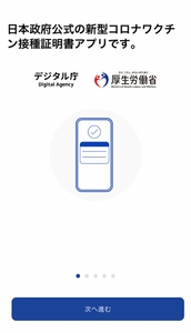 必ず「日本政府公式の新型コロナワクチン接種証明書アプリです」という文字があることと、デジタル庁、厚生労働省の表記があることを確認して進めてください。