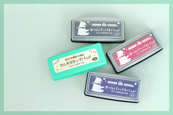 シールDEネームが取り扱っているスタンプ台は、染料系のマルチスタンプパッドと、顔料系のオールパーパスパッドの2種類。どちらとも油性マジックのような万能インクを使用しています。速乾性で消えにくくアイロン不要で、お洗濯も可能です。