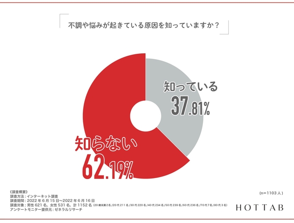 その背景には、肩こりや腰痛、体のだるさ、イライラ、体の冷えなどの不調や悩みを何かしら感じていることもわかりました。しかし、全体の6割の方が、原因がわかっておらず、同じく全体の6割の方が対策も取っていないことがわかりました。一方で、対策を取っている4割の方は、睡眠時間の確保や湯船に浸かるなどしていて、効果を実感していました。