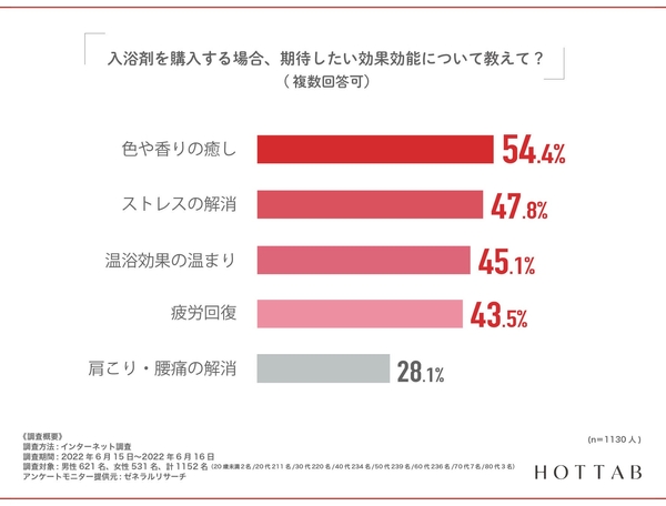 一般の方々は、6割の方が「お風呂派」であり、入浴していることがわかりました。なお、入浴剤を選ぶ際に、約半数の方が癒しやストレス解消といったリラックス効果を求めており、その次に温浴効果や疲労回復といった体の機能回復を期待して購入している方が多いことが判明しました。