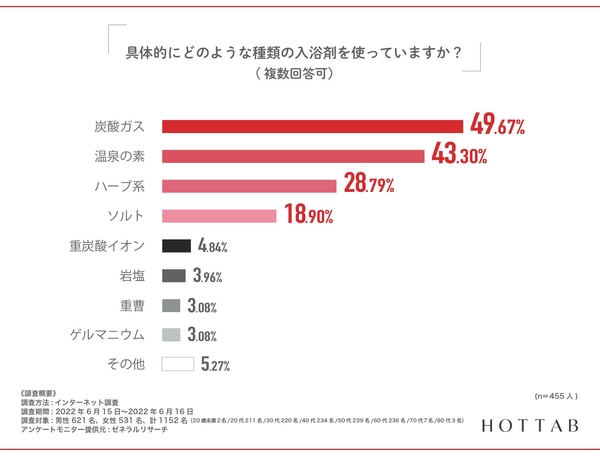 無香料・無着色・塩素中和の重炭酸入浴剤「ホットタブ」は、有効成分が温浴効果を高め、体を芯から温め、湯上り後も温まり感が持続します。このホットタブを注目する入浴剤か聞いたところ、87%が「とても注目する」「注目する」と回答しました。