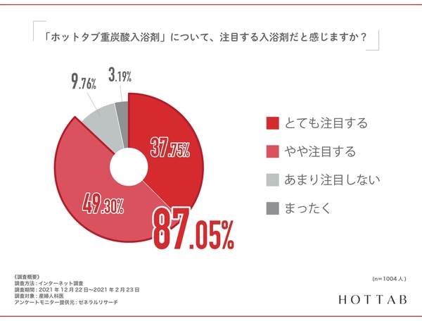 また、重炭酸入浴剤「ホットタブ」の商品概要(特徴、効果効能、成分、価格など)を提示したうえで、「あなたは重炭酸入浴剤「ホットタブ」に ついて、注目する入浴剤だと感じますか?」と聞いたところ、87%が「とても注目する」「注目する」と回答しました。