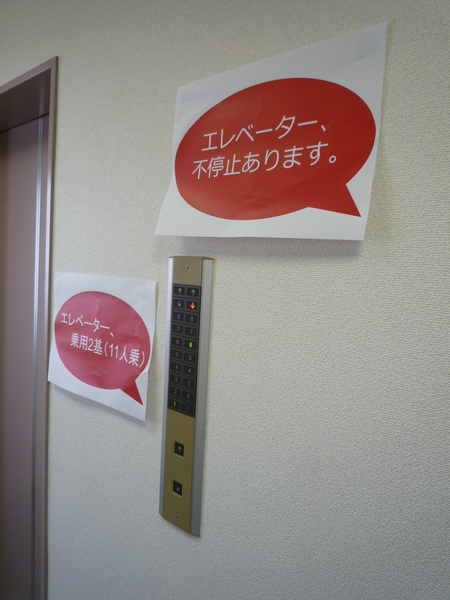 たとえばエレベーター不停止は、セキュリティの大きな売りですから写真のように大きく貼りましょう。もちろんエレベーターの前に。