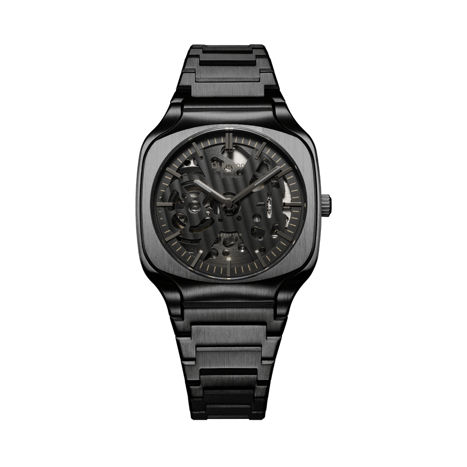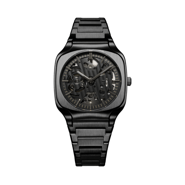 37mmのコンパクトなケースとブレスレットには、高耐久な316Lステンレススチール製ブラックPVDコーティングを施し、統一されたマットブラックの質感が構造的な美しさを際立たせます。スケルトンダイヤルからは、自動巻ムーブメントの精緻な動きを覗くことができ、トーン・オン・トーンの針とインデックスがモダンな奥行きを演出。反射防止コーティング付きのサファイアクリスタルが、視認性と耐傷性を高次元で両立しています。