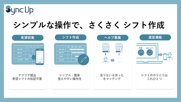 「Sync Up」は、飲食、小売、物流をはじめとしたサービス系企業を対象に、アルバイトスタッフからのシフト希望収集、シフト作成、複数店舗間のヘルプ調整が可能なSaaS型シフト管理サービスです。シンプルで直感的に操作可能なUIにより、シフト管理担当者は操作マニュアル不要で簡単にシフト作成・管理に利用いただけます。また、アルバイトスタッフはスマートフォンアプリ上でシフト提出や勤務シフト情報の確認が可能なことに加え、全店舗のシフト募集情報を閲覧し、希望する空きシフトへ応募することが可能となっており、効率的な人員調整を実現しています。