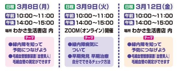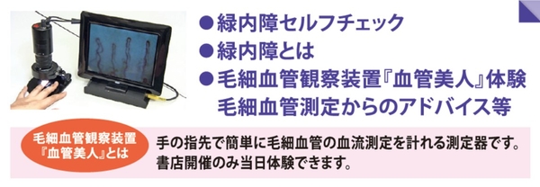録画にはなりますが、今回は緑内障を専門とする医師による緑内障についての聴講できます。また、緑内障のリスクとして体内の血流の悪さが言われており、今回はご自身の全身の血流の状態が簡単に見れる装置「血管美人」も体験ができます。