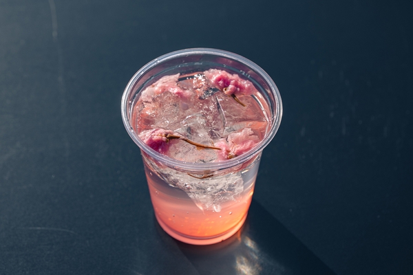桜風味のソーダ。浮かぶ桜の花びらが春の彩りを演出し、さっぱりとした味わいが特徴です。