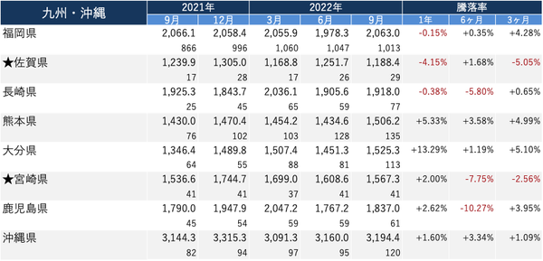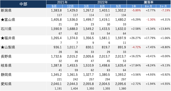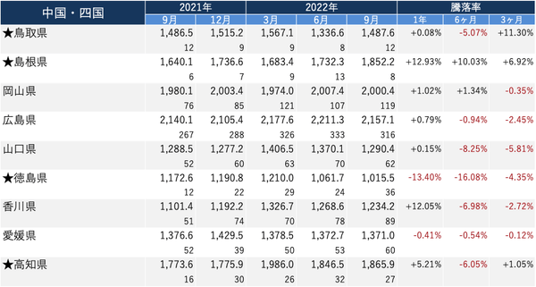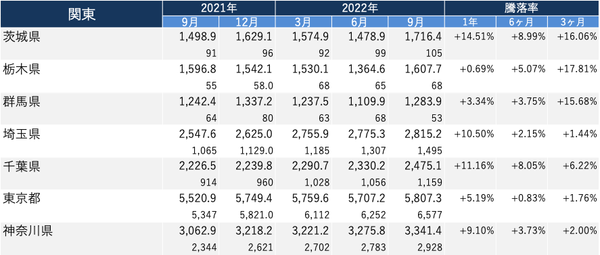 ・各エリアで、2022年9月の価格/1年前と比較した騰落率がトップの都道府県は以下の通り。