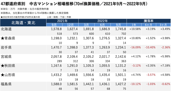 【北海道・東北】 価格:「宮城県」 2,142万6,000円/騰落率:「北海道」 +10.58%