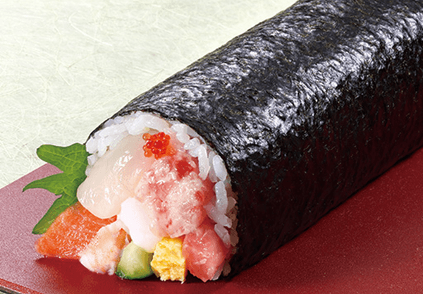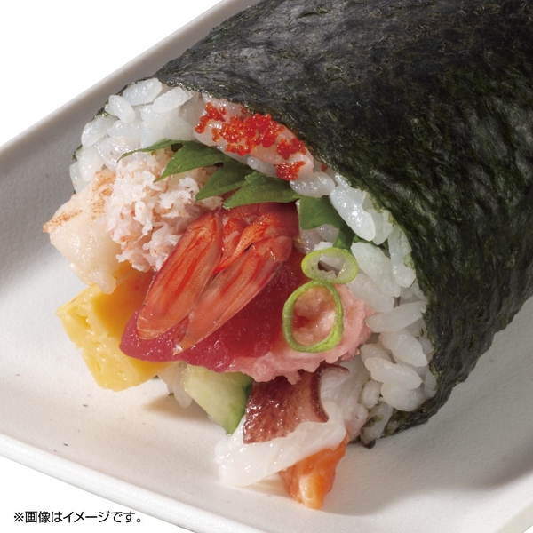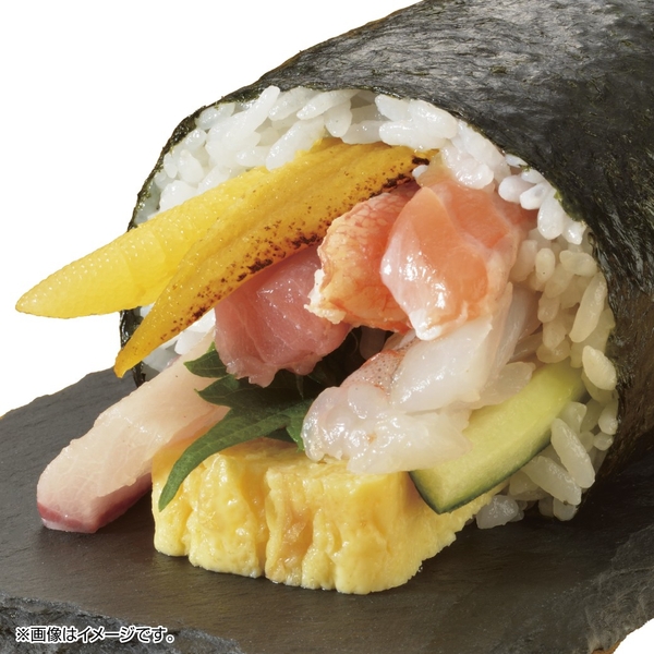 北海道産帆立やずわいがに・伊勢黒潮まだい・生サーモンなどバイヤーが厳選した8種類の具材が入った極太太巻。