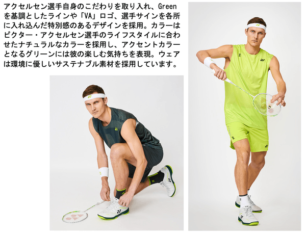 アクセルセン選手は、選手としての実績だけでなく、外国語の習得やジュニアの育成などに積極的に取り組む姿勢や、誠実で明るく気さくな人間性で関係者やファンからも慕われる存在でもあります。本コレクションの発売を通じて、そんな彼の人間性についてもっと多くの方に知っていただきたい、バドミントンをさらにグローバルに発展させていきたい、という弊社からの願いも込められています。