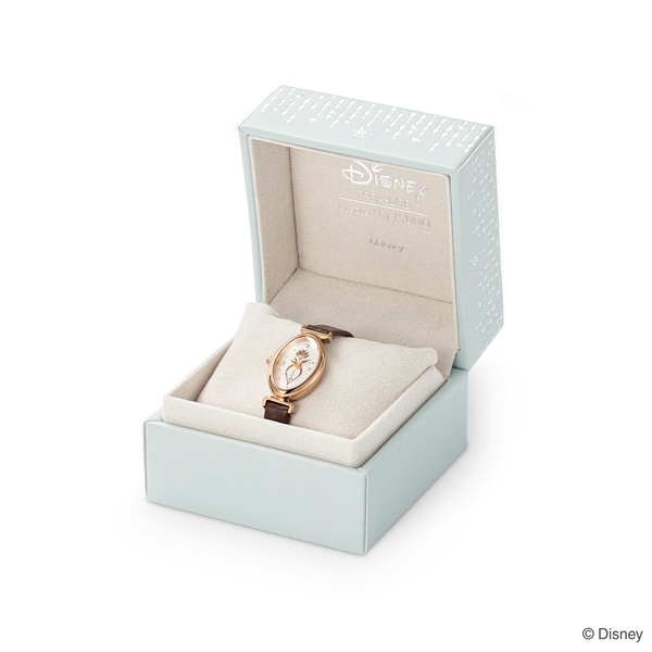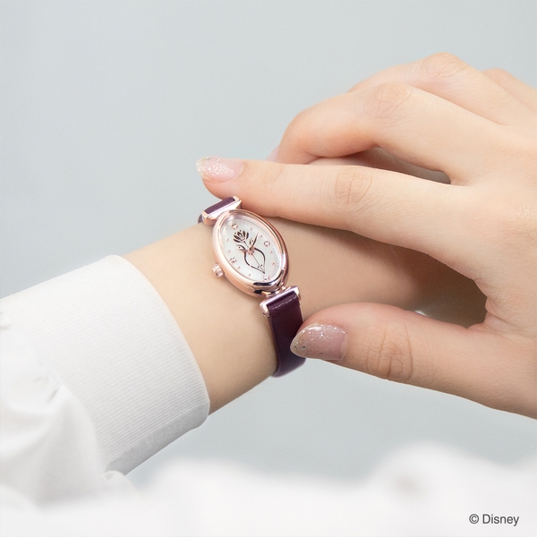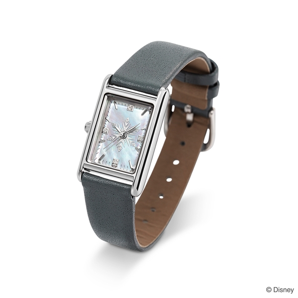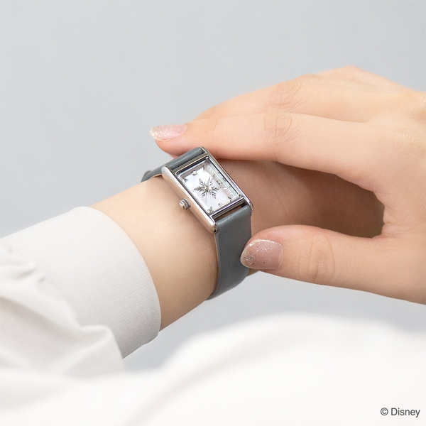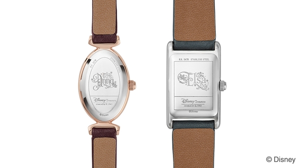 このほどの新作は、雰囲気も性格も異なるけれども、お互いを信頼し合い助け合う「アナ」と「エルサ」を、それぞれのデザインで表現しました。「アナ」のデザインはピンクゴールドカラーのオーバル型で、文字盤にはドレスに描かれている植物のような模様をほどこし、衣装からイメージしたボルドーカラーの革製ベルトを使用した腕時計です。「エルサ」のデザインはシルバーカラーのスクエア型で、文字盤には雪の結晶をデザインし、ブルーグレーのベルトを使用しました。ベルトにはプレーンなシームレス素材を用いており、シックな印象。どちらも落ち着いた色味で、インデックスの12.3.6.9時の箇所にはダイヤモンドを留めた、大人のジュエリーウォッチです。