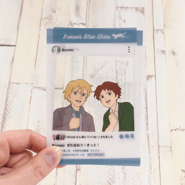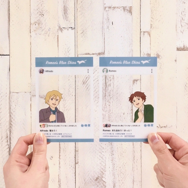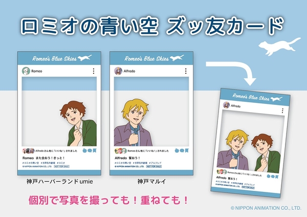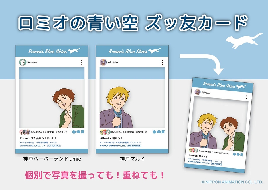 神戸umie内「ロミオの青い空~ピッコロショップ~」では「ロミオ」、神戸マルイ内「ロミオの青い空『ボルゴ横丁雑貨店』」では「アルフレド」デザインのカードをご用意。2枚重ねるとアニメの名シーンを再現することが可能です。