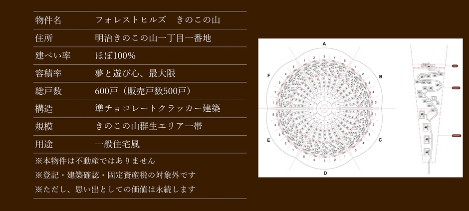 1975年に誕生した「きのこの山」は、発売以来、兄弟ブランドである「たけのこの里」とともに、多 くのお客さまに親しまれてきました。両ブランドでは、これまでに「きのこ・たけのこ総選挙」や「国 民投票」など、ユニークなキャンペーンを通じて話題をお届けしてまいりました。近年は、「きのこの 山ワイヤレスイヤホン」の発売や、世界的デザイナー・コシノジュンコ氏とコラボした特別ファッショ ンショー「きのコレ」など、新しい取り組みでも注目を集めています。 今回の企画は「不動産販売」という形式をユーモラスに取り入れながら、「きのこの山」の世界観を 拡張するものです。パッケージに描かれた小さな山々や家々は、これまで多くの人の想像の中だけに存 在してきた空想の風景でした。本企画では、その空想をあえて現実世界に持ち出し、「もしも、きのこ の山が実在したら?」という発想のもと、現代のテクノロジーと表現手法を用いて再構築しています。 これによって、「存在しない場所を眺め、楽しみ、手元に迎える」という新しい体験価値の創出を目指 しました。 パッケージに描かれた「あの家」が、まるで本当に存在しているかのような細やかな設定を施し、 「区画番号」「間取り」「カードキー」「権利証書」にいたるまで、ひとつひとつのディテールに徹底 してこだわりました。見れば見るほど発見があり、知れば知るほど思わず笑ってしまう。「きのこの 山」らしい、本気で作り込んだ遊び心に満ちた企画です。