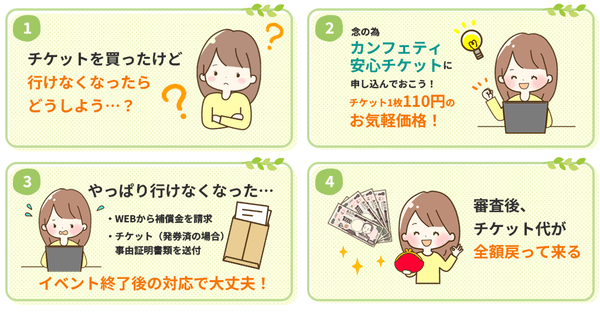 カンフェティで購入したチケットであれば、基本的にすべてのチケットで利用可能※。チケット購入後5日間以内に、所定のフォームよりチケット1枚110円のお申し込みをしておくことで、万が一イベント当日に参加できなくなった場合に、病院の領収書など不参加理由を証明する事由証明書類のご提出で、チケット代金全額を補償いたします。