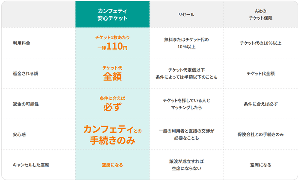 リセールでは、そのチケットの買い手が見つからなければチケット代金の返金はされないのに対し、本サービスではイベントの人気に関わらず、不参加理由が規定の条件に当てはまれば必ず返金されます。