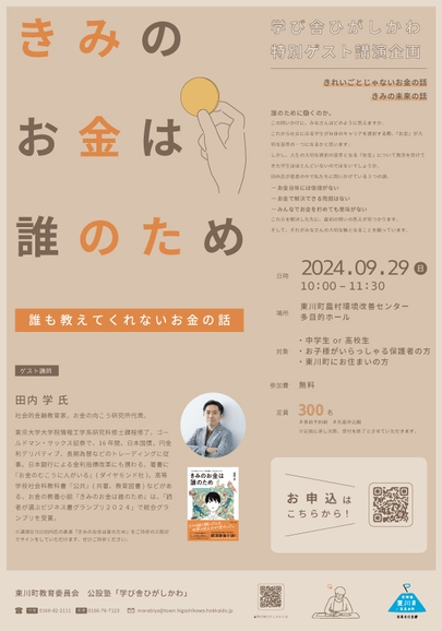 東川町教育委員会では、2024年9月29日(日)に東川町農村環境改善センターにて、『きみのお金は誰のため』の著者である田内学氏をゲストにお招きし、「きみのお金は誰のため-誰も教えてくれないお金の話-」講演会を開催いたします。経済と金融の正しい知識、お金の価値とその向こうにある人の想いについて語っていただきます。参加無料となりますが、事前の申し込みが必要となります。