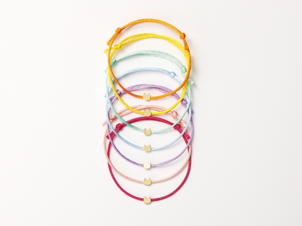 まんまるなお顔とピンと立った耳がキュートなネコのコードブレスレット。プレートの素材はK10YG10金イエローゴールド