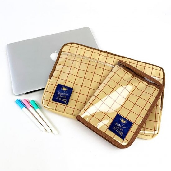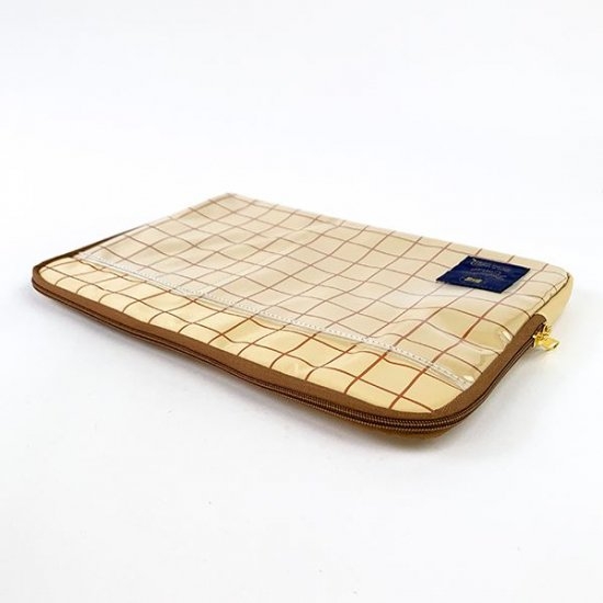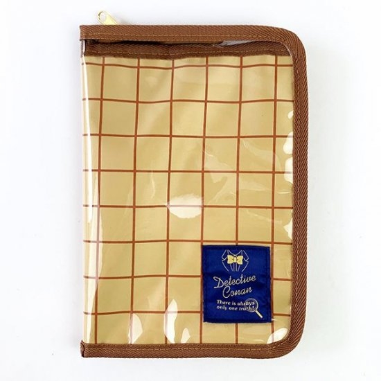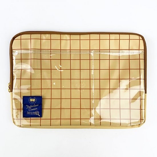 こちらが今回ご紹介するガジェットケース。ホームズをイメージした落ち着いたチェック柄で、大人も持ちやすいですよね!アクセントとして周りのファスナー部分は濃いブラウンです。クリア素材のポケットが付いていてスマートフォンやノートなどを入れられるから便利♪外付けポケットがあるのは、かなりプラスポイントです。